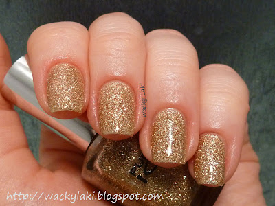 On it's own the gold glitter is very pretty as well. The glitter is comprised of small mostly gold, but also some copper particles. It is very dense and covers well. Two coats for full coverage with no visible nail line. Can easily be worn on it's own. I topped it off with two layers of top coat to get a smooth finish...