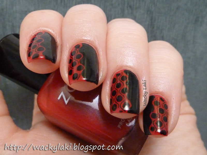 For this manicure, I started out with a base of three coats of Zoya Rekha , a lovely red, slightly dusky jelly cream. I then stamped using Wet 'n Wild Black Creme and Bundle Monster plate BM-209. The stamp pattern does not have a straight edge which kind of gave me trouble with aligning them evenly on all the nails. With the image being smaller than a full nail stamp, I stamped it closer to one side of the nail and painted the unstamped part of the nail black using acrylic paint. The wavy line from the stamped pattern was my guide for the split....